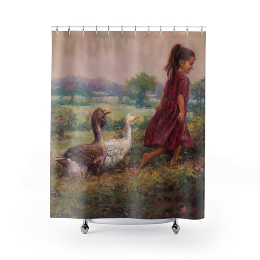 Goose Girl Shower Curtain - Little Girl with animals Design for Bathroom Decor