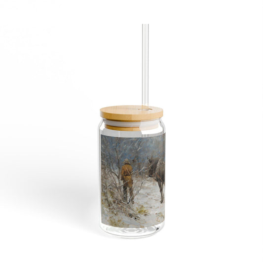 Winter's Work| Working Horse Pulling Logs Artistic 16oz Sipper Glass with Eco-Friendly Bamboo Lid